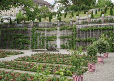 Andererseits sind die Aussichtskanzel aus Rohbeton, die verspielten Buchsreihen auf der zweiten Terrasse, die bemalten Pflanzenkübel sowie die Holzbänke eindeutig die Sprache unserer Zeit. Auch die Schmuckbeete, die heute eher launig bepflanzt werden, orientieren sich nicht an historischen Vorbildern, sondern folgen lediglich ästhetischen Ideen. So hat die aktuelle Gestaltung durchaus Bezug auf die barocke Grundidee genommen, aber dennoch moderne Interpretationen hinzugefügt.